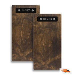 Menyplattan Plywood är vackert utformad och är en mycket prisvärd träplatta. Menyplattan Plywood Slim är i färgen mörk Plywood med metallplatta i svart med silverfärgare skruvar. Denna med redan färdigt tryck på bägge sidor på metallplattan DRYCK / MENY (vändbar)